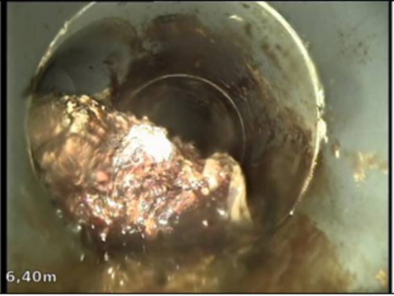 La présence de cette matière empêchait les eaux usées de s’écouler de manière fluide et créait des débordements à répétition. Après avoir réalisé l’inspection télévisée du réseau pour déterminer la nature exacte de l’origine de l’obstruction, nous avons réalisé le fraisage du béton avec notre robot de fraisage depuis l’intérieur de la canalisation.